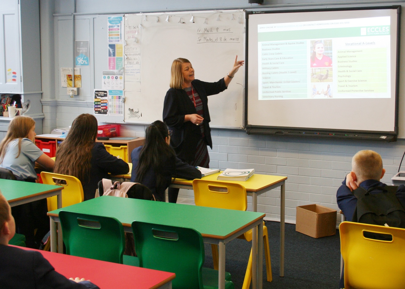 In rotation the students visited seven presenters from different sectors of the world of work. These included; the Dakota Hotel for hospitality and HR and a chef for catering, Greater Manchester Police, Manchester United Foundation, Digital Bees from the Co-operative Bank, B&K Business and Salford College. The presenters told them all about the places where they work, how they got into their chosen career and the opportunities available to our students.